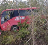 Camión de pasajeros se salió de la carretera de cuota Mérida-Cancún